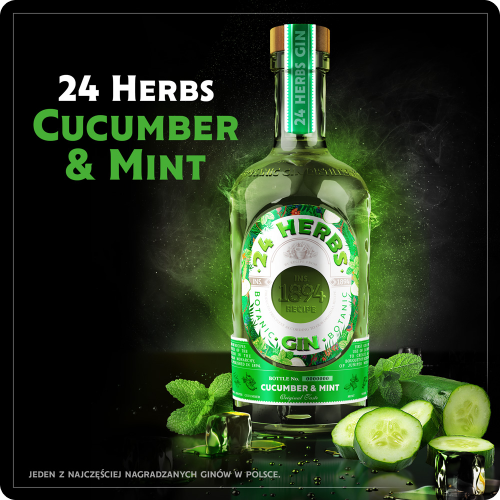 Gin 24 zioła Ogórek Mięta to rodzimy polski gin stworzony na bazie naturalnego jałowca. W tej odmianie wyróżniają się przede wszystkim ekstrakty z mięty i ogórka.