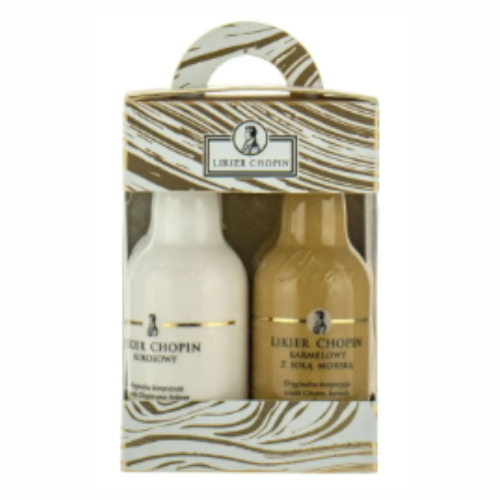 Zestaw czterech mini likierów Chopin (2x Kokos 50 ml oraz 2x Karmel z Solą Morską 50 ml) w eleganckim kartoniku.
