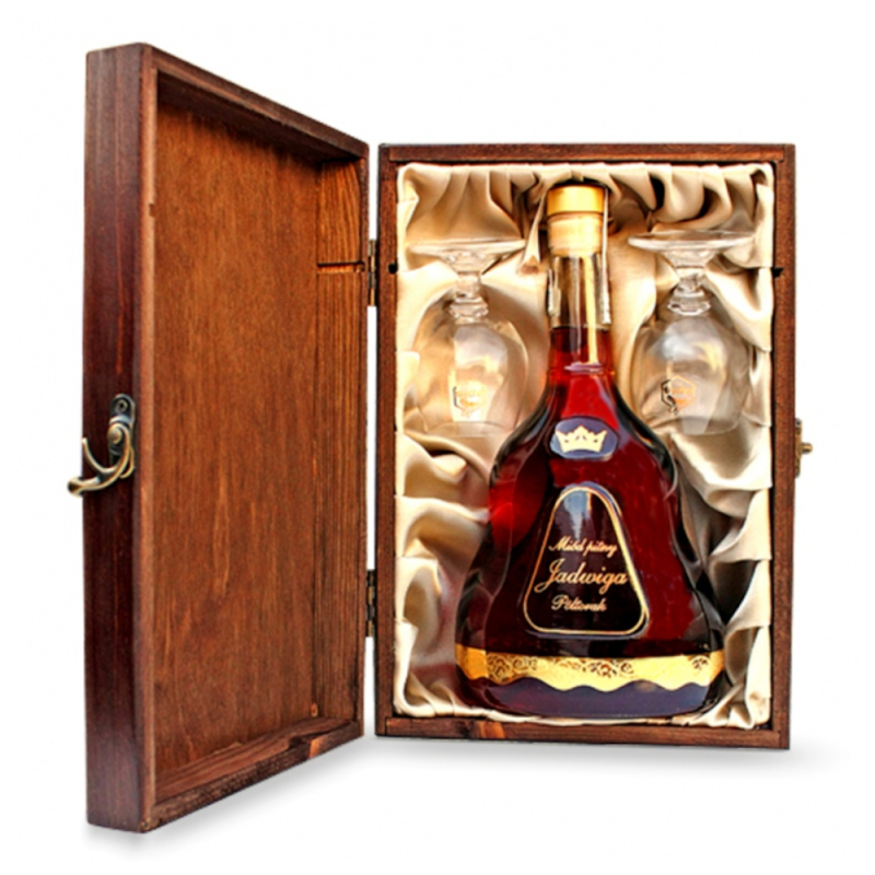 Ekskluzywny zestaw z miodem pitnym Półtorak Jadwiga w złoconej karafce oraz dwoma kieliszkami. Całość umieszczona w drewnianej skrzyni wyściełanej atłasem.
