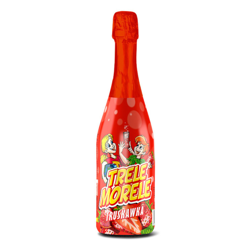Trele Morele Truskawka. Słodkie Owocowy, gazowany napój bezalkoholowy, wyprodukowany z dodatkiem naturalnych soków. Wyśmienita soczystość, pełen smak i słodycz dojrzałych owoców zamknięta w prawdziwie szampańskiej butelce. Doskonale uzupełnia smak ciast, deserów i lodów. Świetnie smakuje podawane solo, delikatnie schłodzone lub w temperaturze pokojowej.