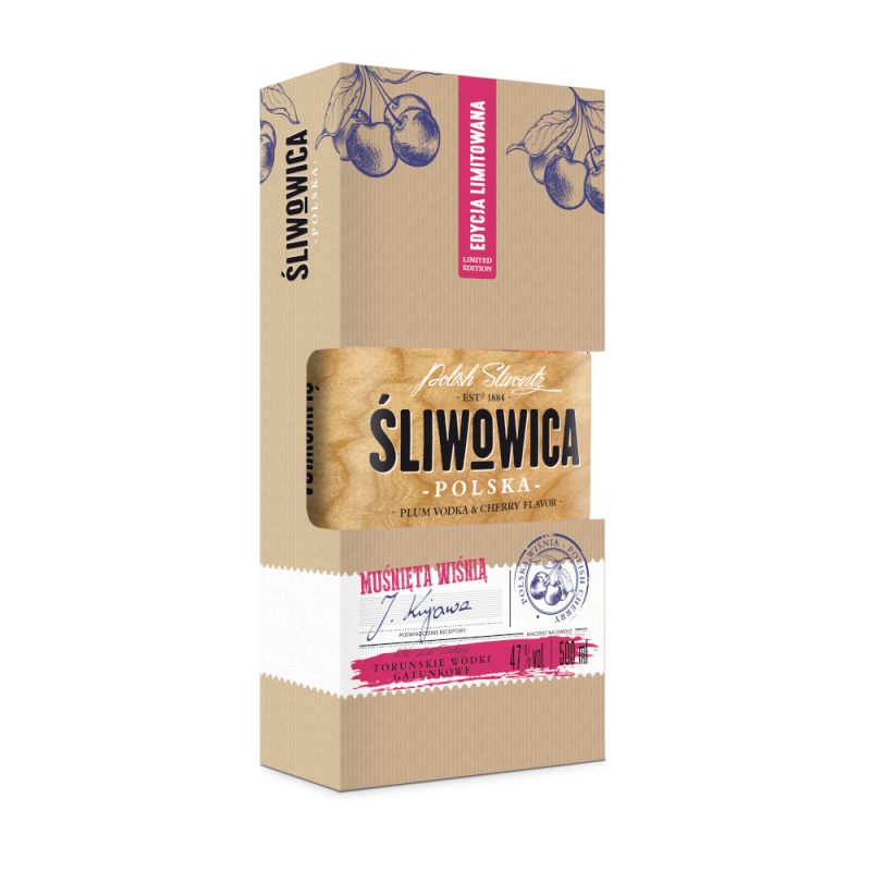 Śliwowica Polska to tradycyjny polski trunek gatunkowy produkowany z leżakowanego destylatu śliwkowego. W wersji muśniętej wiśnią dodatek maceratu na wiśnie, tworzy wyjątkową nutę smakową.
