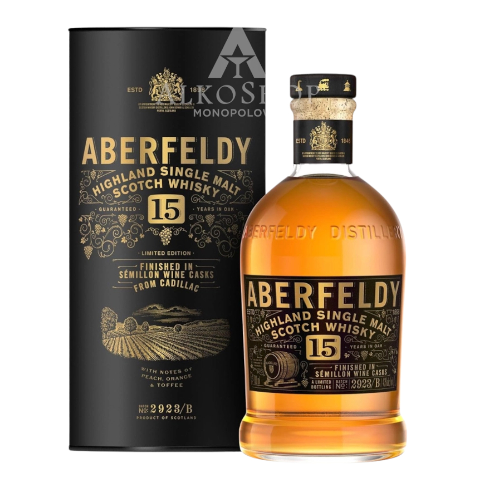 Aberfeldy 15 yo Cadillac Wine Cask to limitowana edycja whisky z destylarni Aberfeldy, zaprezentowana w 2023 roku. Początkowo dojrzewała w beczkach ponownego napełnienia (tzw. refill casks), a przez ostatnie sześć miesięcy finiszowała w beczkach po winie Semillon Cadillac, pochodzącym z 40-hektarowej posiadłości położonej w samym sercu Entre-deux-Mers w Gironde, na południe od Bordeaux.