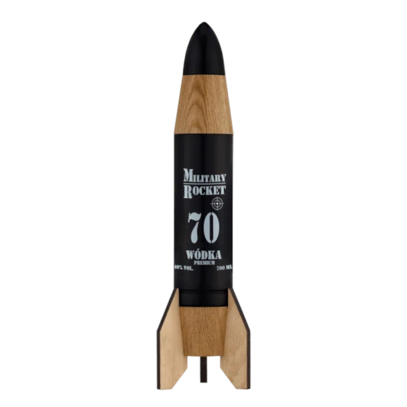 Wódka Dębowa w butelce Military Rocket 50. Prawdziwa wojskowa rakieta świetna na prezent. Alkohol dostępny w kalibrze 0,7 l. Strzel w dychę. Wódka znajduje się w stylizowanej rakiecie, którą można otworzyć odkręcając czarny grot.