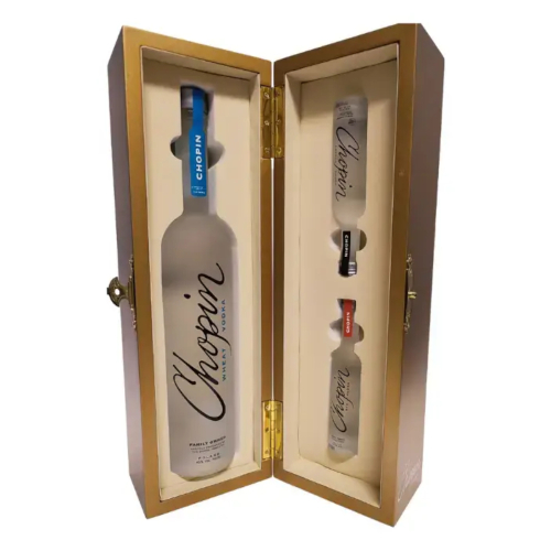 Zestaw wódek Chopin w złotej skrzynce.